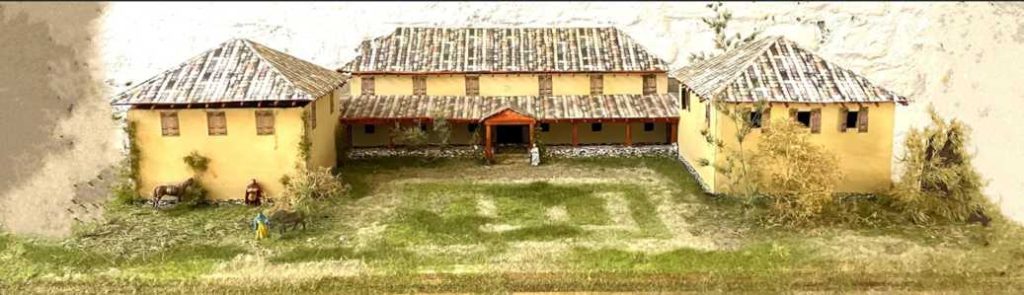Het hoofdgebouw werd omstreeks het jaar 100 gebouwd. Het was 50 bij 30 meter en had een min of meer symmetrische plattegrond. Er was een zuilengang op het zuiden en aan twee kanten van het gebouw bevonden zich zijvleugels.